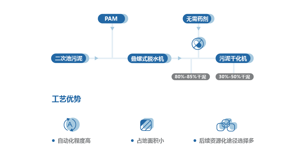 叠螺式污泥脱水机+低温干化:易处理低浓度,粘性较强的污泥,机械脱水与自然干化结合的方案,大大降低传统干化的处理成本,并且在70℃下低温干化,系统安全稳定。
